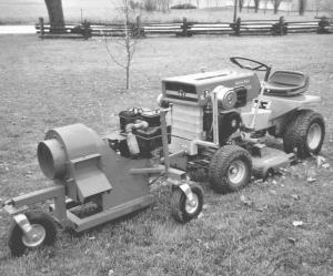 Shute pushes the unit ahead of his Massey Ferguson riding mower. "I use it to clean leaves off my 2-acre lawn each spring and fall," says Shute. "The blower runs at about 3,000 rpm's so it has a lot of force. It'll blow pine cones off the yard, and we also use it to clean sand and salt off our asphalt driveway."