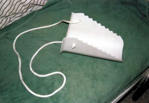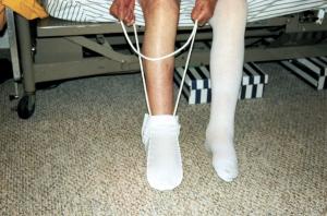 It consists of a plastic "scoop" on the end of a rope. You pull the stocking onto the angled end of the scoop, then drop it to the floor and pull it onto your foot. The serrated edge of the scoop holds the stocking in place as you pull up on the rope. Works great. Available from Homecraft Compression Stocking Aid, Germantown, Wis. (ph 262 251-7840). (C.F. Marley, Nokomis, Ill.)