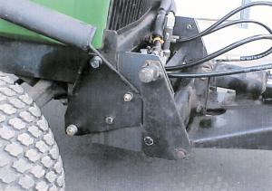 I don't know if this will be of help to anyone else but it sure helps me. I have a Deere 400 lawn tractor with a front-end loader. The problem was that I couldn't put any other front-mount equipment on it when the bucket was on. To solve the problem, I made up a set of extension brackets that moves the mounting point for any front-mount equipment out about 6 in. so the loader can stay in place. All I had to do after the brackets were in place was to make up new hydraulic hoses to reach the couplers. Otherwise, it's easy to hook up the snow blade or snowblower. I just raise the bucket up out of the way, or take the bucket off the lower arms for better visibility. (Arnie Amrhein, 13717 Excelsior Blvd., Minnetonka, Minn. 55345 ph 952 938-8682; email: mnjdnut@aol.com)