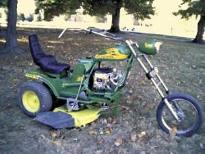"We then got the chopper angle by tilting the motorcycle frame up and building a subframe beneath it that's bolted and welded to the tractor frame," Cook says.