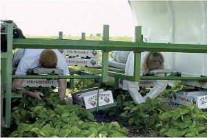 An overhead shade keeps both pickers and berries cool and shelters them both from rain.