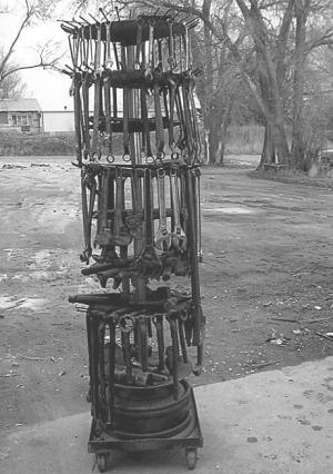 "I use it to store everything from box end wrenches to pipe wrenches and crescent wrenches," says Catron. "The 3/4-in. dia. metal rods are the broken teeth off old side delivery rakes.
