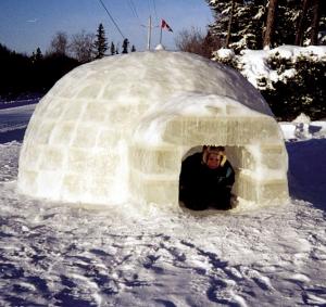 We cut the ice with a power saw and haul it to the front lawn. Then, we use snow and water for mortar. I can make one like this in a day and a half, weather permitting.