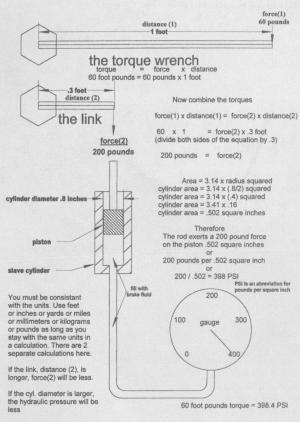 With his device, the length of the link is 0.3 ft. When placed in his equation of Torque = Force X Distance, with the torque being 60 ft. lbs, and distance being 0.3 ft., the only unknown was force. By dividing both sides by 0.3, force was shown to be 200 lbs.