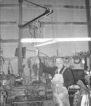 "As any lathe operator knows, heavy lifts and a steady hand are frequently called for. I decided to do something about it. I put up a length of door track overhead which serves as a track for a lightweight winch. I put the hanging support on hinges so it can swing left to right. Then I hung a low cost, lightweight, electrically-powered winch from it. This combination allows me to pick up whatever I'm working on and then gently guide it into my lathe."