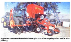 The rig can be used in the fall to apply fertilizer after the crop is taken off, and in the spring before and/or after planting. It can handle ridge-till, no-till or conventional row crops; deep or shallow placement; and simultaneous application of dry, liquid or anhydrous fertilizer. Other available options include anhydrous metering, electronic scales, markers, knife sealers, pneumatic metering and delivery of dry or suspension materials, and various coulter, knife, pump and plumbing combinations.