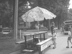Motorized Picnic Table AG WORLD Ag World When Mark Meitner and friend Jim Stenseth saw a motorized picnic table at the Star Spangled Celebration in Richland Center Wis a few years ago they decided they would have one of their own They started with a Deere model 68 riding mower s chassis and then built a table on top of it Meitner admits the drive unit is small but they haven t broken anything even when hauling more than 500 lbs uphill over rough terrain The 8 hp Tecumseh engine has a 1-gal regular gas tank with a pull start at the rear of the table Although they left the mower s shift controls clutch and brakes intact they extended a linkage from the clutch to a lever hidden off to one side that steers it You almost can t tell who s driving it Meitner says To make the machine run quietly they routed the exhaust through an old snowmobile muffler and added foot rests and guards around the exhaust Because they wanted it to fit into a pickup bed Meitner and Stenseth designed it to fit between the truck s wheel wells Top speed is about 6 mph and turning dia is 24 ft It has three forward gears and reverse The picnic table has four cup-handler holes for drinks and can be fitted with an umbrella at the center The men plan on building a bigger one with more features including lights for late nights at the campgrounds Contact: FARM SHOW Followup Mark Meitner 201 E Main St West Union Iowa 52175 ph 563 422-5206; email: kristissalon @fbx com