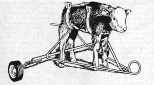 The Calfcart, developed by Montana rancher Buck Dear and manufactured and sold by Tim Spencer, Great Falls, makes the mother cow think her newborn calf is running away, so she follows along. The idea enables the rancher to move newborn calves and their mother cows to get them away from a scours-ridden calf-drop area, or the main herd. The cart will go in mud or snow, if not unusually deep, says Spencer.