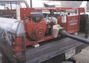 It has its own engine so no modification of the pickup is required. It mounts on vibration-free rubber skids and simply anchors itself in the pickup's stake pockets. A throttle controls engine speed which in turn controls pto speed, and a lever puts the pto in and out of gear.