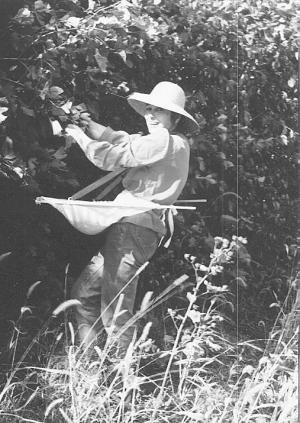 The cotton muslin pouch holds about 10 lbs., depending on how much weight your neck can support, says Sarah Chapman, inventor. Just tilt a corner on the harvester to unload your cargo.