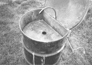 The barrel has a removable wash tray about 8 in. down from the barrel's lip. The tray sets on top of a clamp ring that he removed from the top of the barrel and welded to the barrel's sides. The pump is suspended about two thirds of the way down the barrel and plugs into a 110-volt outlet and switch box that mounts on the cut-away lid. The pump's electric line and washer hose runs up through a bunge hole in the cut-away lid. By removing two hinge pins, Lowe can remove the top lid in order to clean out the barrel. At the same time, the cut-away lid can be lifted off together with the pump, washer nozzle, and switch box.