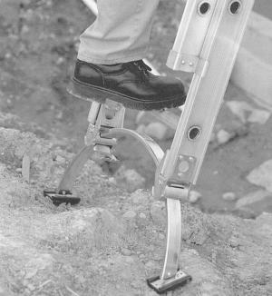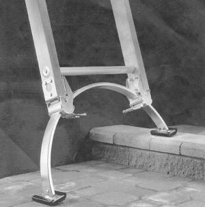 When you set it up on uneven ground û or even on steps û the ladder self levels by adjusting it with one foot. Once in place on the arch, the ladder locks in place. There's a lock on each bracket which you tap with your toe to release. Fits most ladders û wood or aluminum û from 12 to 20 in. wide.