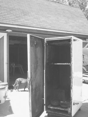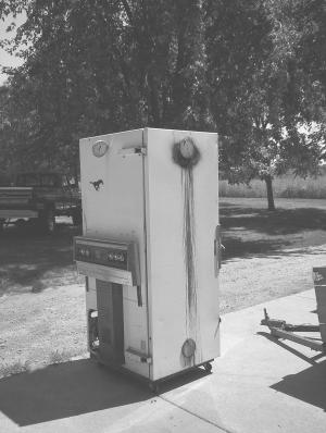 He got the freezer and stove free for hauling them away. "I mounted the stove burners at the bottom of the smoker," explains Franzen. "Then I mounted the oven thermostat in the smoke chamber and the control panel on the outside."