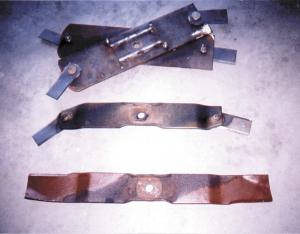 Gallaher started with an old set of blades from the mower. "The blades are made from heavy steel and provided a strong base for the replacement tips," says Gallaher. "I just cut off the ends of the old blades and drilled a hole for each shoulder bolt used to mount the new tips. A washer placed between the base and the tip allows the tip to swivel on the shoulder bolt. Balancing the base is a one-time job that doesn't have to be repeated when new tips are installed. I raised the deck 1/2 in. to get the same cutting height. This was the only adjustment I had to make to the mower," says Gallaher.