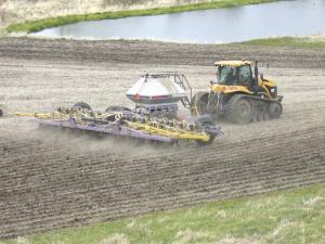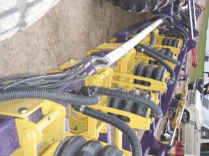 It has uniform down pressure and infinite depth control on the row units. Each row unit has a 16-in. air bag similar to those used for air ride suspension on over-the-road trailers. The air bag creates down pressure on the primary coulter, whic