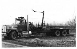 Stocking added a hydraulic-controlled big bale fork to the side of a 1975 Mack tandem axle truck that loads bales in two side-by-side rows and unloads them the same way with no need for the driver to ever get out of the cab.