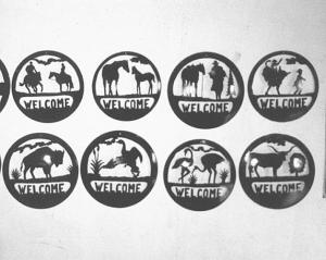 Golden makes almost anything that can be made out of metal: wall signs, gate entrance signs, ranch ornaments, security fence, decorative railings, coat and hat racks, pickup headache racks, head board inserts for log beds, ornamental weathervanes, fireplace sets, paper towel holders, rodeo trophies, bookends, lamps, bar stools, and custom art in general.