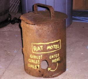 I made this "rat motel" out of a length of old 10-in. heavy-wall pipe and welded a lid and handle to it. I cut the hole 2 in. off the bottom and it's just the right size for rats. Cats and dogs can't get in. The poison is kept inside and not spread everywhere. I can also move it wherever the rats are. A night in this motel ensures rats a nice long sleep. (Francis "Butch" Soehnlen, 10523 Soehnlen Rd. N.W., Beach City, Ohio 44608 ph 330 756-2244)