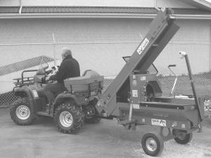 The 2-wheeled firewood processor is powered by a 13 hp Honda gas engine and can handle logs up to 12 in. in diameter. The log is manually fed into the machine. The machine is equipped with a chain saw cutting system, hydraulic splitting, and output conveyor. It has a capacity of about one cord per hour.