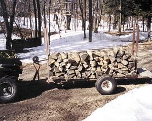 My homemade, heavy duty firewood trailer is designed to haul firewood out of the woods wherever I cut it. It measures 8 ft. long and 3 ft. wide. A 1,500-lb. boat winch on front of the trailer is used to put tension on the firewood so that when I pull it over rough terrain the wood won't fall off. Cables from the winch extend back over the firewood pile and run through holes in the trailer floor. There's a platform on back of the trailer so your "helper" can ride along. The front-mounted hitch can be used to "push" the trailer effortlessly to the exact location. I've used this trailer for more than 15 years with great success.