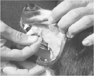 The sampling packet contains a small dental brush, which is used to scrape cheek cells from the inside of the dog's mouth. It's important that this be done prior to feeding the dog, or two hours after feeding. This ensures that the sample doesn't contain dog food remnants, which can interfere with the sample extraction.