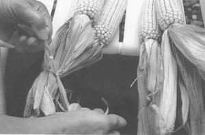 Production requires hand harvesting of the corn ears at maturity after the husk has loosened. "We try to harvest bright colored ears that are filled to the tip," says Hubka. "When picking ears, we make sure that most of the husks are harvested with each ear. Having an adequate quantity and quality of husks with each ear is necessary to make the Decco Corn bundle attractive and durable for hanging up. Once harvested, we store the ears in a well ventilated crib or storage area to prevent molding of the husk prior to bundling."