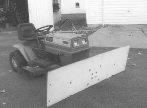 It consists of a 2 by 7-ft. piece of plywood with a metal bracket on back. The bracket attaches to mower in place of his snow blade. The board is raised and lowered by a hand-operated lever that's attached to a spring.
