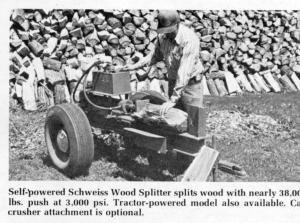 The hydraulic Schweiss Wood Splitter splits wood with 38,000 lbs. of push at 3,000 psi. The 4 in. dia. cylinder comes with 24, 36 or 48 in. stroke and features automatic high speed return after splitting. The unit, available in both tractor or selfpowered models, has no belts or pulleys. Self powered models are operated with a 4 hp. Clinton or Briggs & Stratton gas engine. Direct drive with a 6:1 gear ratio yields 8 to 10 hp.