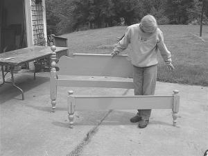 "Instead of throwing out the bed, I sanded down and repainted the headboard and the footboard, then made a bench seat out of plywood. The headboard serves as the back of the bench and provides the rear legs, while the footboard provides the front legs. I painted the bench red, white, blue and yellow. It looks really nice on our front porch."
