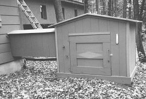 The bridge has a metal roof, with the walls and floors made from hardboard siding. The siding is nailed to a wooden framework, with 3 1/2 in. of insulation lining both walls. Aluminum foil lines the walls to retain heat.