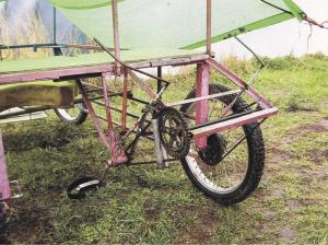"The drive mechanism is made up of single-speed and 10-speed recycled bike parts, and the frame is thin-wall 3/4-in. tubing with 2-in. tube legs, which the wheels are mounted to," he explains. "The whole thing was built with a buzz box welder and a metal chop saw."