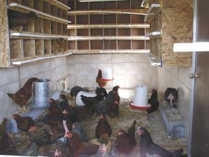 Students built nesting boxes on three of the walls out of particle board with pvc pipe roosts and installed pvc sleeping roosts on the other wall. To make the roof waterproof, they screwed on a piece of rubber roofing left from a local roofing job and attached rain gutters and a downspout to catch rainwater and run it into a 55-gal. barrel.