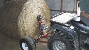 The patent pending Hay Baby lets you load and unload bales without ever leaving the driver's seat. It rides on turf tires and has an electric-operated winch that's used to raise or lower a bale spear bale. The winch is operated by a remote control mounted on the ATV handlebars and is wired to the vehicle's battery.