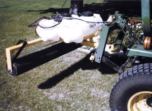 The roller is made out of 8-in. dia. plastic water pipe, with two 8-in. dia. hard rubber wheels driven into both ends of the pipe. Indoor-outdoor carpet is glued and screwed onto the pipe. A 1/2-in. dia. plastic pipe with a series of small holes drilled into it at 1/2-in. spacings mounts above the roller and drips chemical onto it.