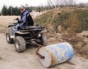 Mark Eilers, Tower Hill, Ill., stood a plastic barrel on end and placed a plastic pipe on end inside at dead center. Then he filled the barrel with concrete. Once the concrete set, he cut off the other end of the barrel and slipped a steel rod through the plastic pipe. The ends of the rod weld solidly to a wishbone hitch. The steel rod turns freely inside the plastic pipe with little friction. Best of all, there are no bearings to worry about.