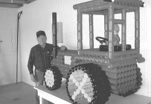 With help from his wife, Betty, Weiss made a 3 1/2-ft. wide by 5-ft. long tractor using aluminum cans held together with silicone caulking.