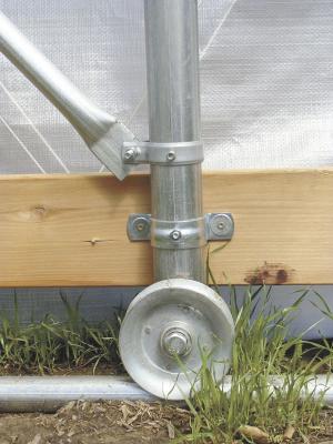"Units can also be mounted on permanent pipe tracks with fixed steel rollers so one or two people can easily move a 16 by 24-ft. home garden unit," he says. "Once you know what you are doing with skids or wheels, you can move a 30 by 48-ft. high tunnel and secure it in place in less than 2 hrs."