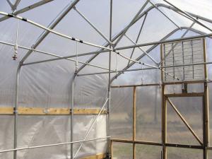 The standard design calls for drop down sidewalls for controlling air movement. The market garden designs also include roof vents. End doors have 26-in. flip-up panels that allow high tunnels to be rolled over existing crops.