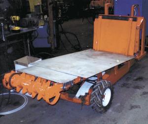 The standard cart is priced at $7,000, or $8,000 for the extended-bed cart. Both are powered by 9-hp overhead valve Honda engines. Hydraulics for the 16-in. lug drive wheels, power rotor and tilting bed are provided by a 5.5 gpm open-center hydraulic pump. Three solenoid valves feed power to the wheel motors and bed lift. The joystick handlebar gives the operator on the riding platform fingertip control of the all-hydraulic cart.