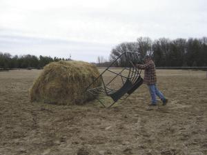 The feeder, which weighs about 100 lbs., is tipped over on top of an 800 to 1,200-lb. round bale. Pull-straps are positioned to hold the bale in place, and then the feeder is gently pulled upright. No tractor loader is required and the feeder slides smoothly across pastures or feedlot. The bale rests above the ground for better hay access and less wasted feed. The welded tubular construction requires no assembly, has no sharp corners, cleans easily and stacks for storage and/or shipping.