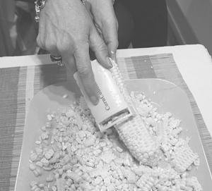 Sweet Corn Cutter FARM HOME Food 33-3-31 This new sweet corn cutter is less messy and safer than a knife. Made of plastic and stainless steel, it measures 7 in. long by 2 1/4 in. wide with a stainless steel cutting blade at one end. The steel blade cuts close to the cob with no waste or mess.