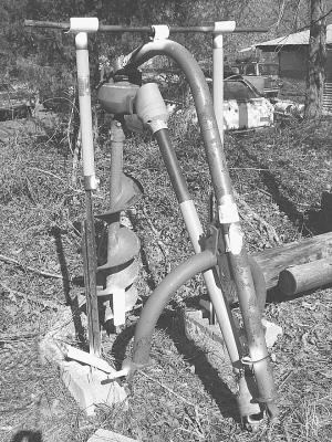 The unit consists of a pair of vertical T-post "legs" spaced about 3 ft. apart, with a 1-in. dia. pipe across the top. The pipe rests horizontally on a pair of cradles and extends through a short length of 3-in. dia. pipe that Oxford welded onto the auger boom. The 1-in. dia. horizontal pipe is held in place on the auger by a pair of washers welded onto it on either side of the 3-in. dia. pipe.