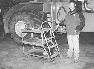 One cart has three shelves and the other two. He attached a cabinet on one of the units for storing tools and other supplies. The curved handlebars work great for guiding the units about, and the spring-loaded feet keep them in place.