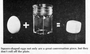 Square-shaped eggs not only are a good conversation piece, but they don't roll off the plate. And, their square shape makes them nice for slicing, the manufacturer notes. The cubing device can also be used as a square mold to cube deviled eggs, meat balls and other foodstuffs.