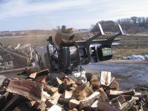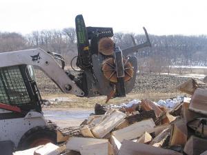 Logs are picked up with the processor's forks, rolled onto the in-feed trough, and moved up to a butt plate by a chain conveyor and roller. Once in position, a high-speed chainsaw activates. When the block is cut, it falls into the splitting trough and is split with a 4 by 24-in. cylinder. The processor can cut wood into lengths up to 20 in. and can split the wood into 4, 6, or 8 pieces, depending on the choice of splitting heads. While it's designed for a skid steer loader, some customers are making modifications to put the processor on excavators and tractors.