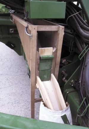 Robinson thought there had to be a better way, so he made a lightweight wooden chute that's designed to set under the tank. One person can easily handle it. Just set the chute under the planter's seed tubes and open them up. The grain runs down the chute and into a seed bag. Once the bag is full you close a metal slide on the chute.