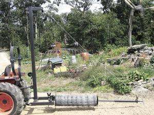 The unroller is made from a piece of 2-in. dia. pipe and two round steel plates - one bolted down and one left free to turn with the wire as the tractor goes along. In places where the tractor can't go, you can easily pull the wire off the unroller by hand.