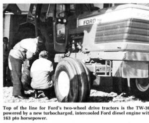 Heading the "totally new" line is the TW-30 at 163 pto hp, the largest, most-powerful 2-wheel drive tractor ever built by Ford (Steiger builds Ford's larger 4-wheel drive tractors). The other two models in the series are the turbocharged TW-20, which at 135 pto hp replaces the Ford 9700, and the naturally-aspirated TW-10, successor to the 8700 and rated at 110 pto hp. All three new TW models are powered by derivatives of the 410 cu. in. 6-cyl. Ford diesel engine.