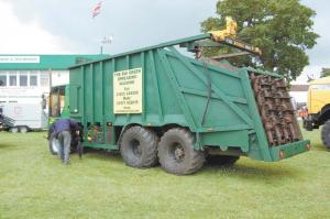 Jackman installed four vertical spreader beaters on back of the garbage truck. The truck's original hydraulic-operated ram pushes manure toward the back to a short chain-driven slat floor in front of the beaters. A 100 hp engine, bolted on the side of the machine, drives a hydraulic pump that operates the beaters, apron chain, and ram.