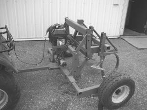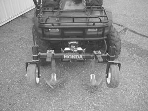 A one-row cultivator was made from two 12-in. sweeps off an old chisel plow. The sweeps were bolted to a 2 by 2-in., 1/4 in. thick steel tube toolbar that fits into the receiver hitch. H-brackets were fabricated for gauge wheels that mount to the toolbar with U-bolts so they can be adjusted for the desired depth. Activ..........